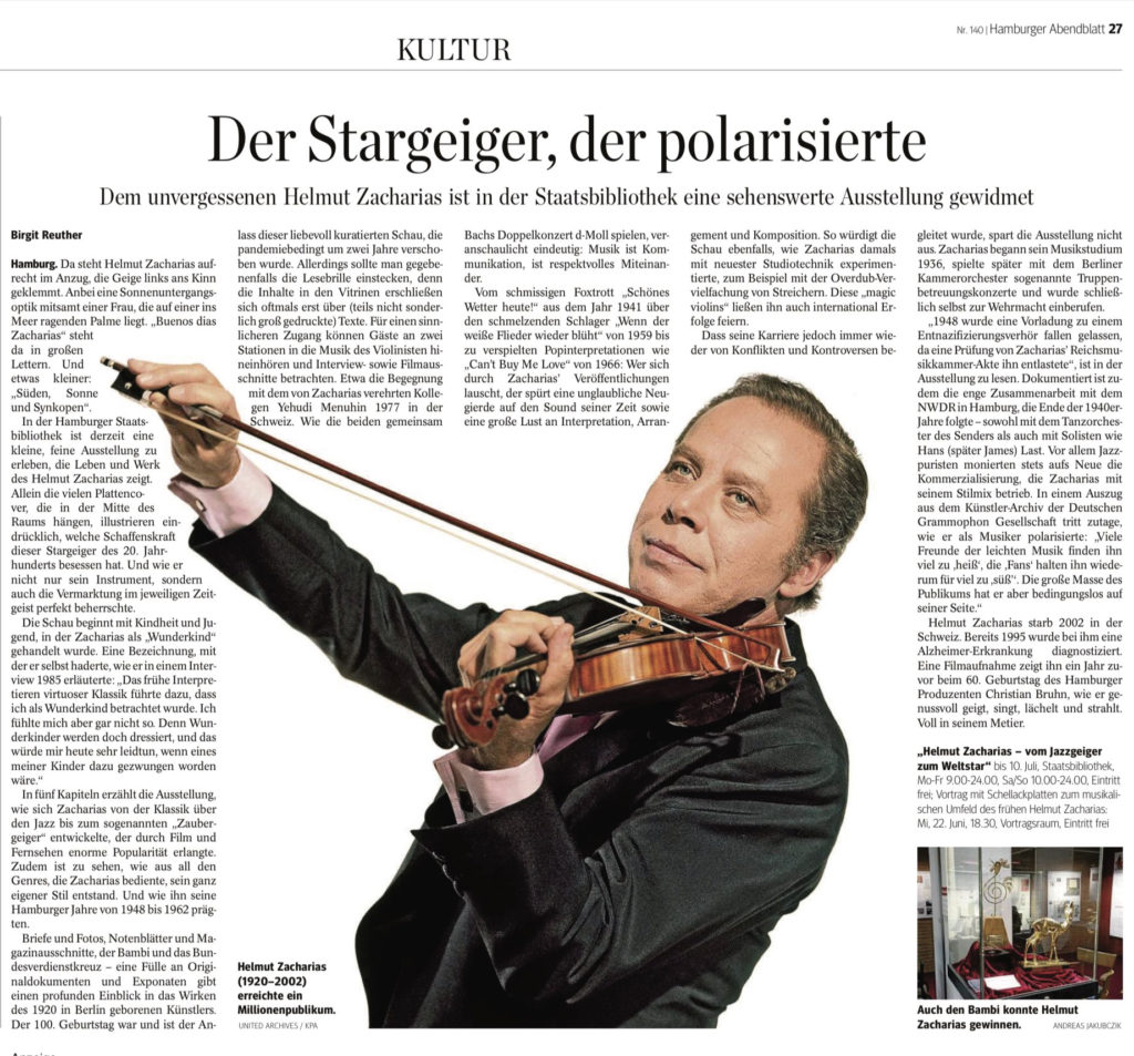 Die Ausstellung präsentiert unter den Titeln „Der Klassikgeiger“, „Der Jazzgeiger“ und „Der Zaubergeiger“ Zacharias’ wichtigste Stil- und Wirkungsbereiche. Dokumente zum kulturhistorischen Kontext, vor allem während seines Wirkens in Hamburg, umrahmen die Präsentation.